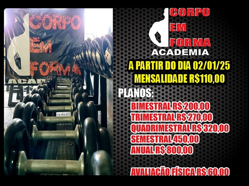 A Corpo em Forma utiliza programas de exercícios físicos totalmente diferenciados, que levam em consideração as suas expectativas e seu estilo de vida. O espaço conta com equipamentos de musculação, pesos livres, esteiras, bicicletas ergométricas, elípticos e os mais variados acessórios para exercícios. Além da orientação e acompanhamento de profissionais capacitados. Estamos com planos especiais, que contemplam descontos por faixa etária e horários, e diversas promoções especiais para você aproveitar.